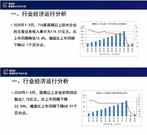 在會議現(xiàn)場,中國建筑防水協(xié)會秘書長朱冬青作出了關(guān)于《后疫情時(shí)期防水行業(yè)的挑戰(zhàn)和機(jī)遇》的主題演講,他從防水行業(yè)經(jīng)濟(jì)形勢分析、疫情對行業(yè)的影響分析和行業(yè)發(fā)展的挑戰(zhàn)與機(jī)遇等方面對主題演講進(jìn)行了專業(yè)解讀。朱冬青秘書長在演講中表示,今年一季度,受疫情影響,防水行業(yè)迎來了前所未有的收入及利潤雙下降,對行業(yè)發(fā)展帶來了不小的沖擊。